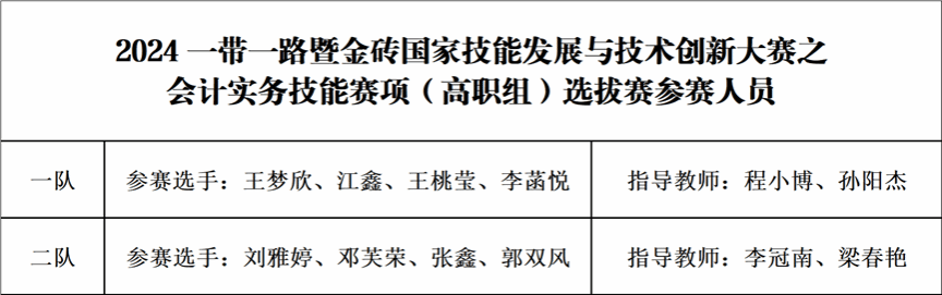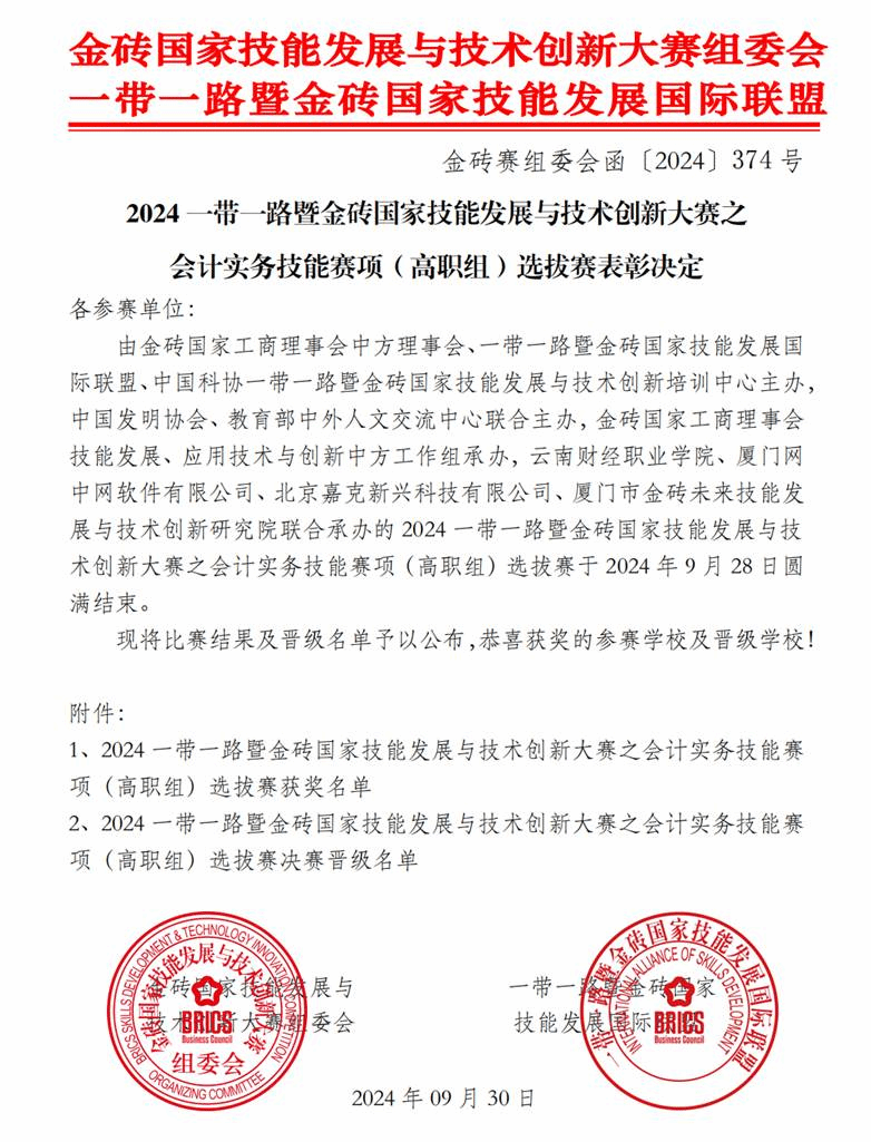 2024年9月28日,由金砖国家工商理事会中方理事会等主办的“2024一带一路暨金砖国家技能发展与技术创新大赛之会计实务技能赛项全国选拔赛”圆满落幕。财经商贸学院两支参赛队积极准备,在我院指导老师团队的精心指导下,克服竞赛时间长、比赛难度大的困难,均荣获2024一带一路暨金砖国家技能发展与技术创新大赛之会计实务技能赛项(高职组)选拔赛全国三等奖。