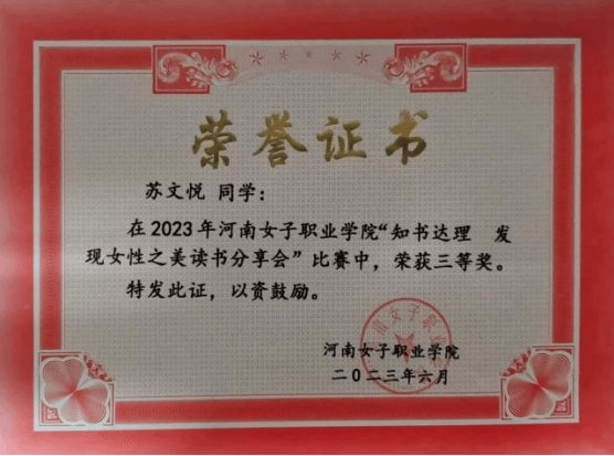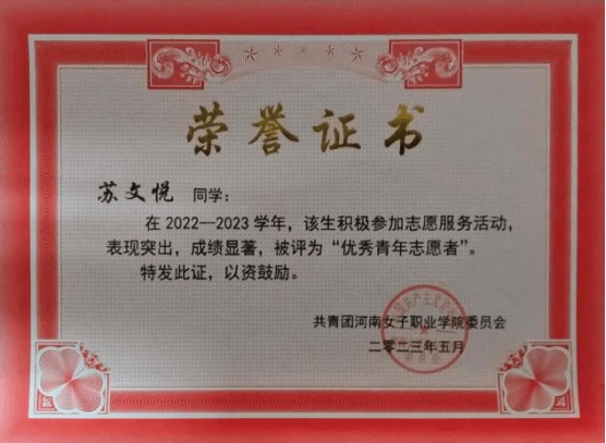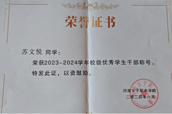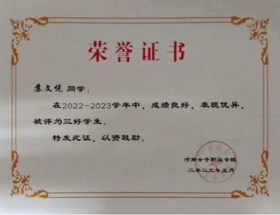 苏文悦在思想、学业、志愿等领域均展现出卓越风采,以实际行动诠释着新时代青年的担当与使命,是财经商贸学院学子的优秀榜样。
