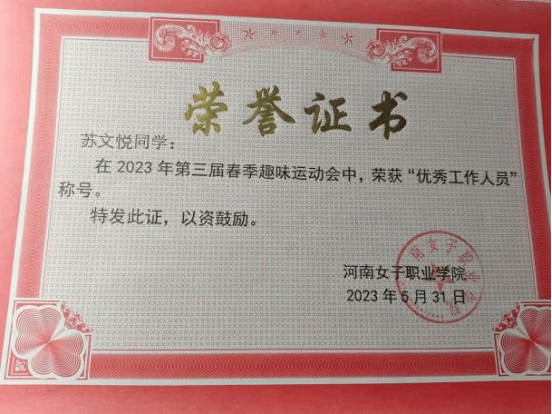 身为国旗护卫队成员,苏文悦用挺拔身姿守护国旗尊严,更以实际行动传递责任与担当。在专升本考试志愿服务中,她贴心为考生答疑解惑、指引方向;在新学期迎新现场,她顶着烈日帮助新生搬运行李、介绍校园,用微笑点亮初遇的温暖。从校园到社会,她的身影活跃在各类志愿服务中,用汗水诠释“奉献、友爱、互助、进步”的志愿精神,彰显出强烈的社会责任感与团队协作能力。